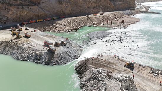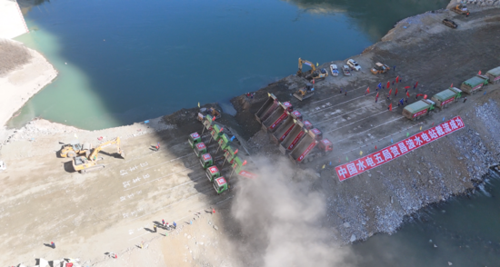 根据2028年底提前发电工期安排,该工程截流时间由11月中旬提前至10月中旬,截流流量由401立方米/秒增加到811.6立方米/秒。本次截流采用单戗堤双向立堵截流方式,一次性拦断河床,截流流量标准为811.6立方米/秒,截流戗堤长度为190米,其中预进占140米,龙口50米,截流戗堤龙口总共抛填石料超过2.66万立方米,历时14个小时,抛填强度2281立方米/小时。