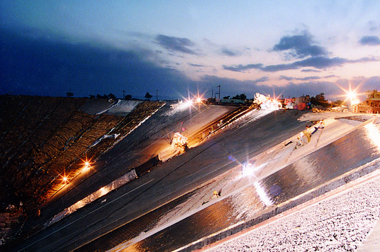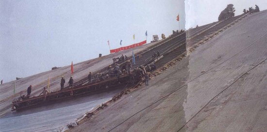 上水库的库区地质堪称“地质博物馆”:岩石裂缝纵横交错,风化严重得像酥饼,透水性极强,地下水位低得几乎“干涸”。更棘手的是,这里几乎没有天然径流,水从哪儿来?全靠上下库的“水循环魔术”。水电五局上水库建设团队紧盯地质难题,不断创新突破,采用“钢筋混凝土全库盆防渗”技术,给全部库岸、库底及主、副坝填筑体上游面库区披上了一层“铁布衫”——上水库混凝土面板堆石坝长464米、高70米(相当于24层楼);库周周长1628米,相当于24个标准足球场大小的17.5万平方米库盆全面衬护混凝土,这件密不透风的“雨衣”彻底堵住了漏水的“窟窿”。这是中国抽水蓄能电站首次大规模应用该技术,堪称“防渗教科书”。另外,上水库工程的建设规模更是搬山填谷的“超级工程”。其土石方工程包括明挖410万立方米、暗挖513万立方米、填筑289万立方米,相当于把半个山头“搬”走,又用土石堆出新的“人造山”。十三陵抽水蓄能电站的上水库,不仅以“全国最大人工水泥天池”的规模震撼世人,更以“全库盆防渗”“大落差循环”等创新技术,成为行业标杆。