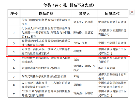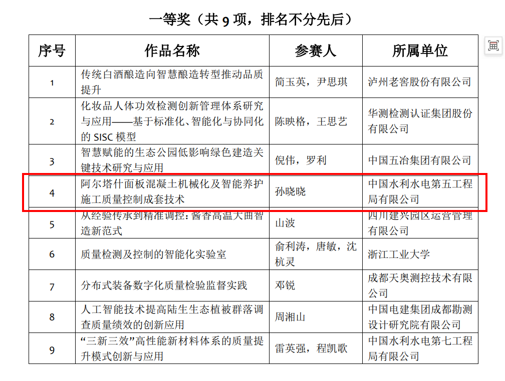 11月7日,第一届全国质量创新案例决赛在浙江杭州召开,来自全国42家单位的49支参赛队伍代表参加启动仪式。《阿尔塔什面板混凝土机械化及智能养护施工质量控制成套技术》获得一等奖。