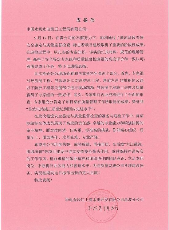华电金沙江上游水电开发有限公司昌波分公司贺信