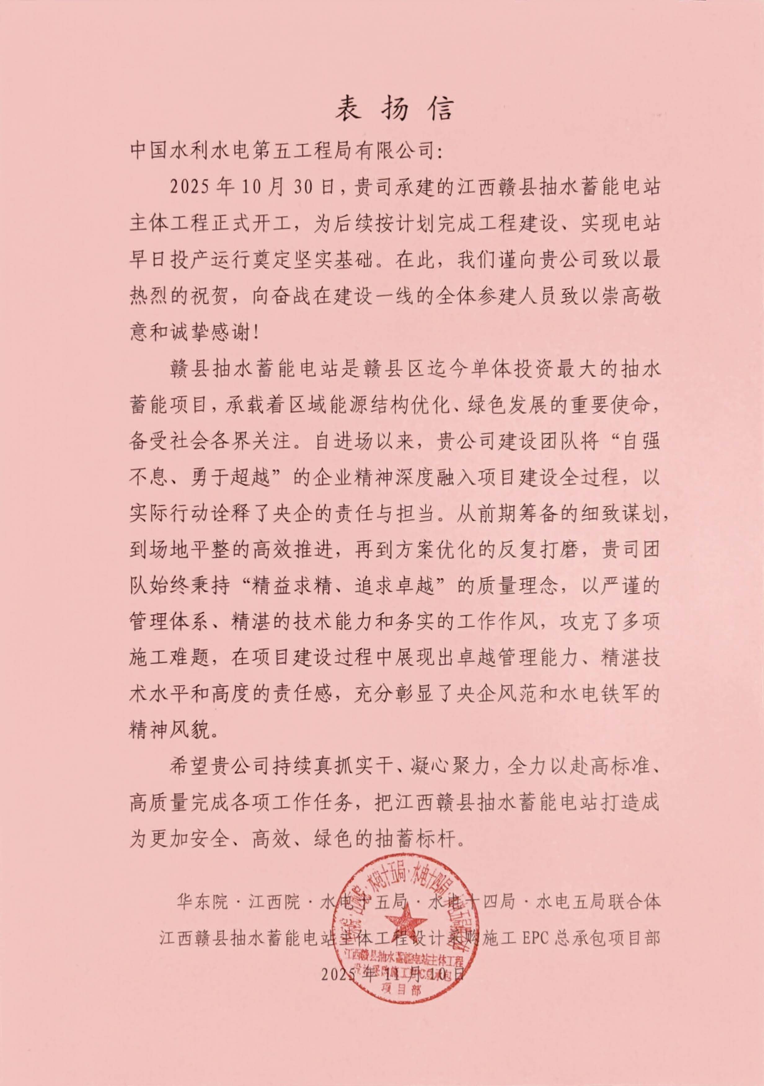 华东院·江西院·水电十五局·水电十四局·水电五局联合体江西赣县抽水蓄能电站主体工程设计采购施工EPC总承包项目部表扬信