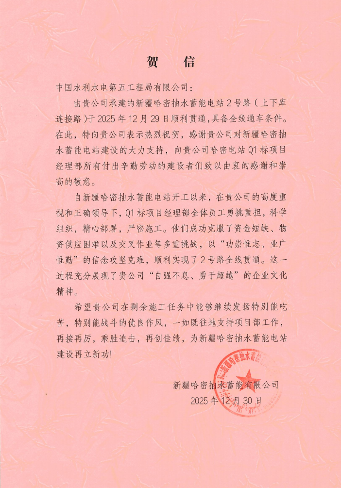 新疆哈密抽水蓄能有限公司贺信