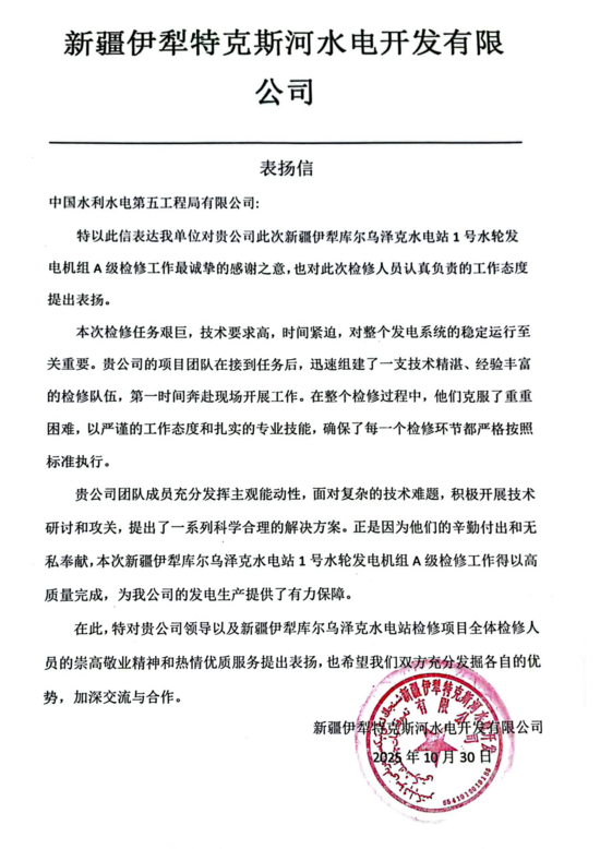 新疆伊犁特克斯河水电开发有限公司表扬信