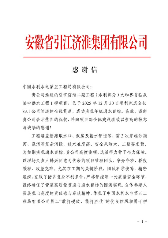 安徽省引江济淮集团有限公司感谢信