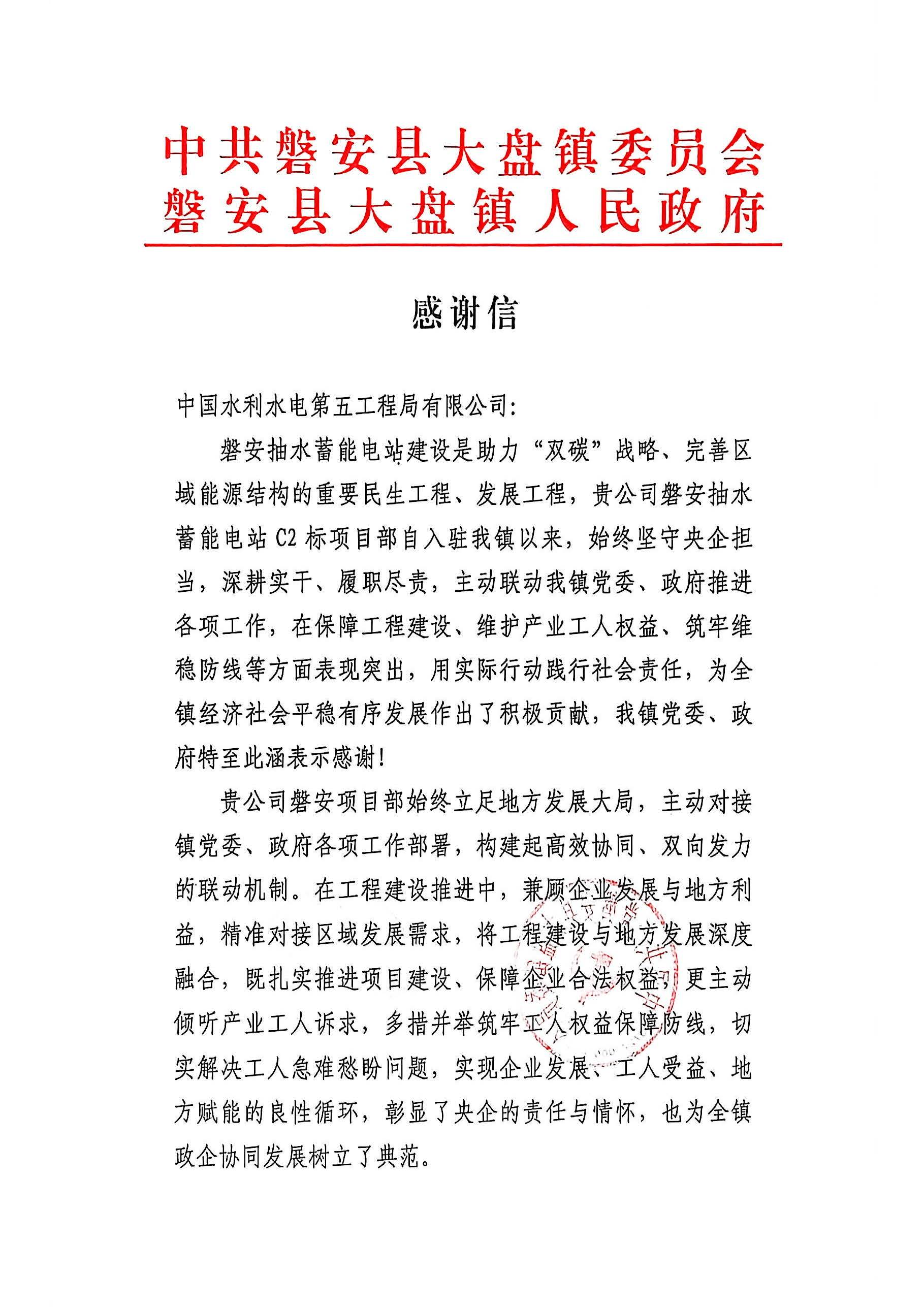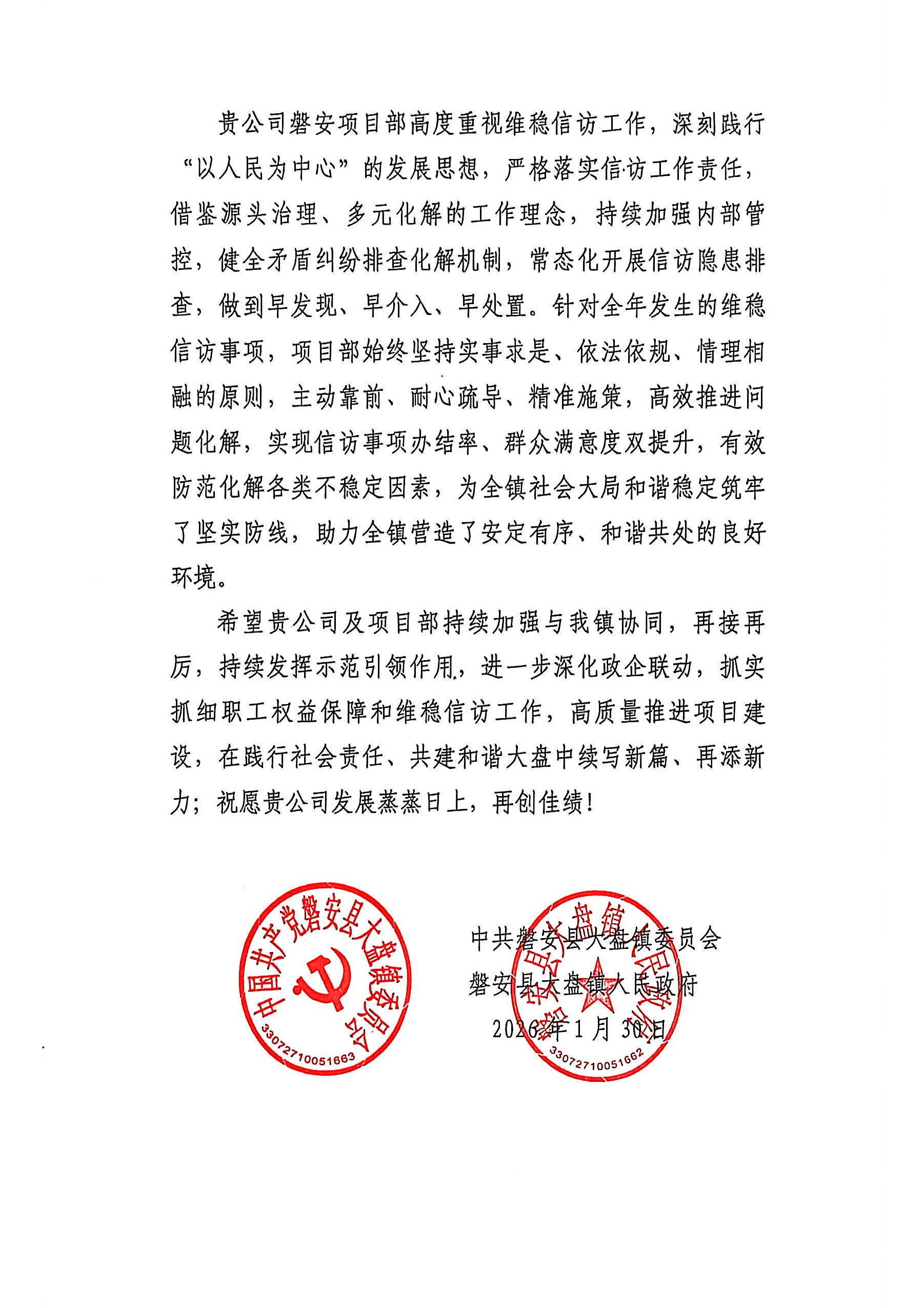 磐安县大盘镇人民政府感谢信