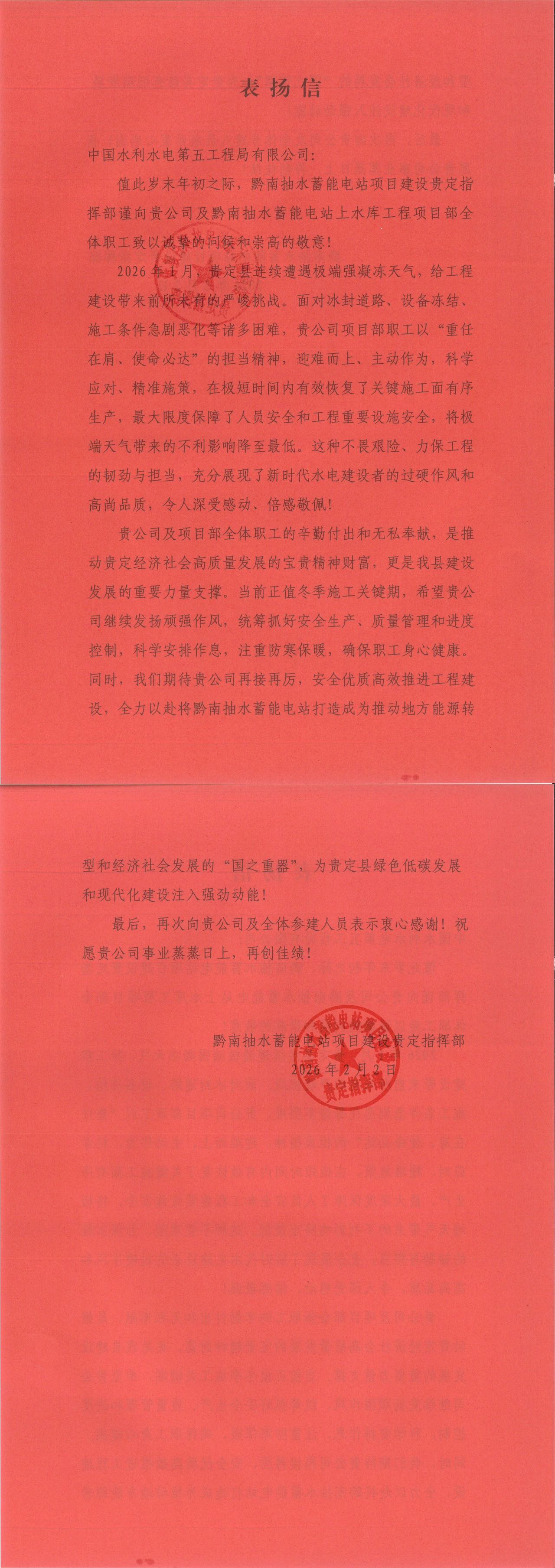 黔南抽水蓄能电站项目建设贵定指挥部表扬信