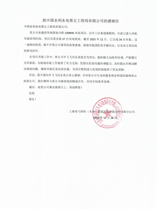 上海电气研砼(木垒)建筑科技有限公司合阳分公司感谢信