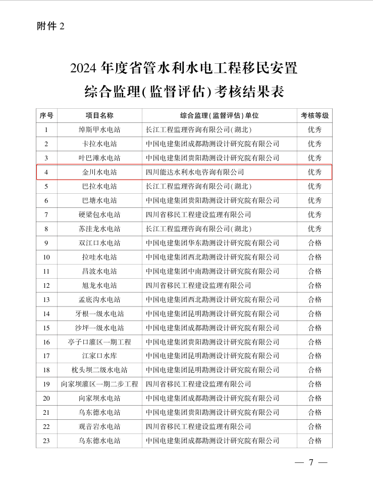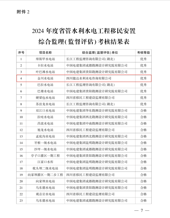日前,公司承担的大渡河金川水电站移民安置综合监理项目,在四川省水利厅组织开展的2024年度省管水利水电工程移民安置监督评估工作考核中获评“优秀”。
