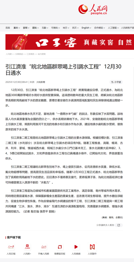 12月30日,引江濟淮“皖北地區群眾喝上引調水工程”將實現建設目標,正式通水,為皖北地區3000萬群眾喝好水用好水提供堅實保障。這項歷時數年的重大民生工程,將解決皖北地區群眾長期飲用高鹼地下水的歷史難題,更標志著安徽在水資源跨區域配置和民生保障領域邁出關鍵一步。