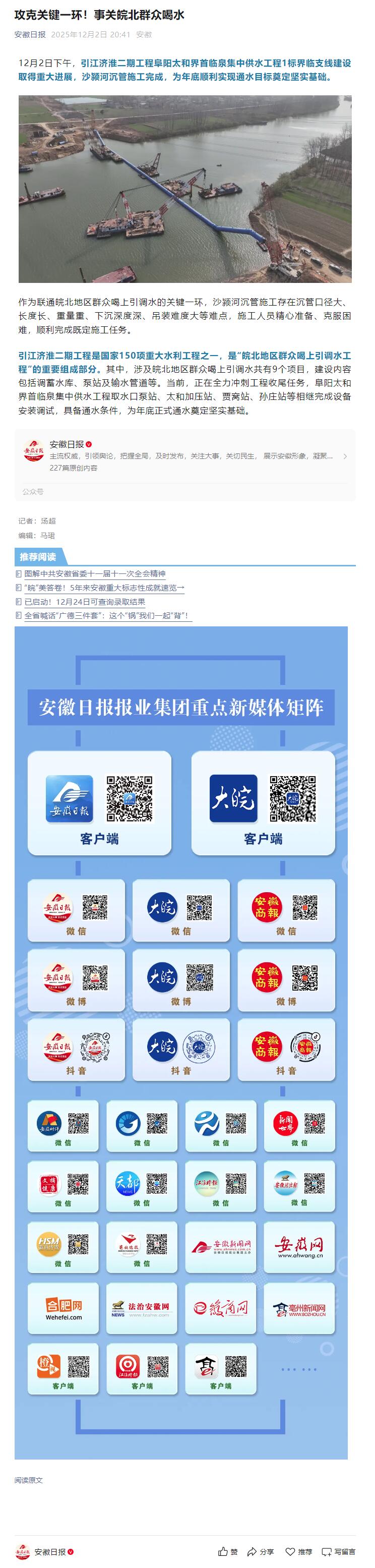 12月2日下午,引江济淮二期工程阜阳太和界首临泉集中供水工程1标界临支线建设取得重大进展,沙颍河沉管施工完成,为年底顺利实现通水目标奠定坚实基础。