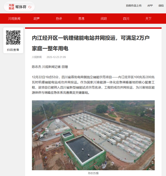链接:内江经开区一钒锂储能电站并网投运,可满足2万户家庭一整年用电|川观新闻 https://cbgc.scol.com.cn/news/7100379