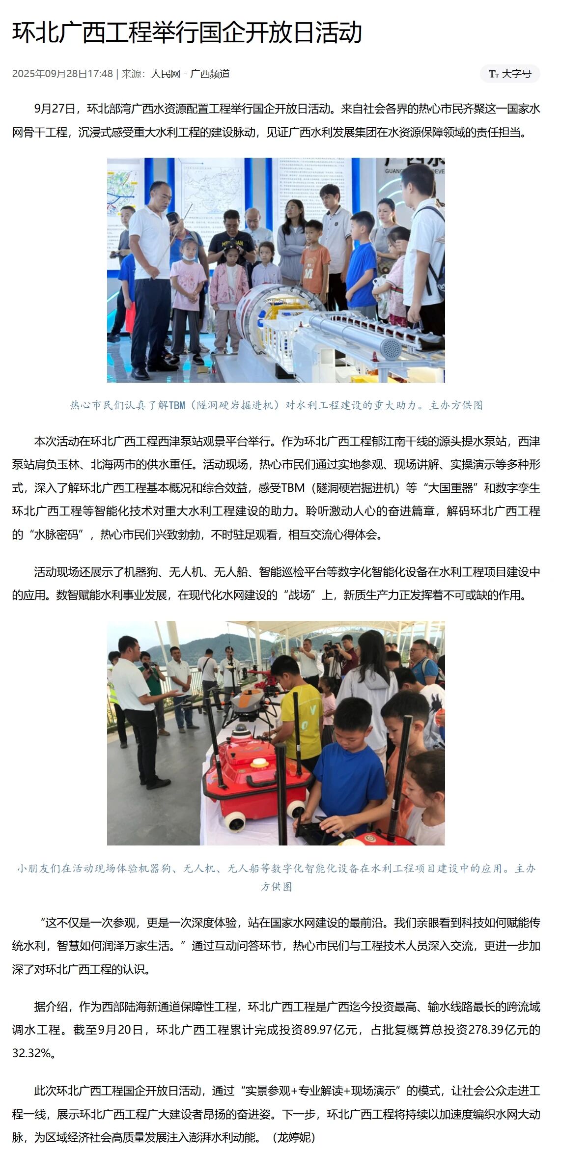9月27日,环北部湾广西水资源配置工程举行国企开放日活动。来自社会各界的热心市民齐聚这一国家水网骨干工程,沉浸式感受重大水利工程的建设脉动,见证广西水利发展集团在水资源保障领域的责任担当。