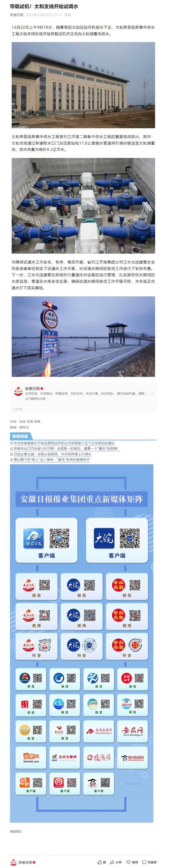 太和界首临泉集中供水工程是引江济淮二期骨干供水工程的重要组成部分。其中,太和支线通过新建取水口门加压泵站和17.8公里输水管道将引调水输送至太和调蓄池,供水流量为每秒4.3立方米。