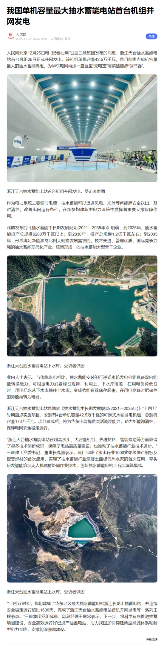 人民网北京12月25日电 (记者杜燕飞)据三峡集团发布的消息,浙江天台抽水蓄能电站首台机组25日正式并网发电。该机组单机容量42.5万千瓦,是目前国内单机容量最大的抽水蓄能机组,为华东电网再添一座巨型“充电宝”与清洁能源“调节器”。