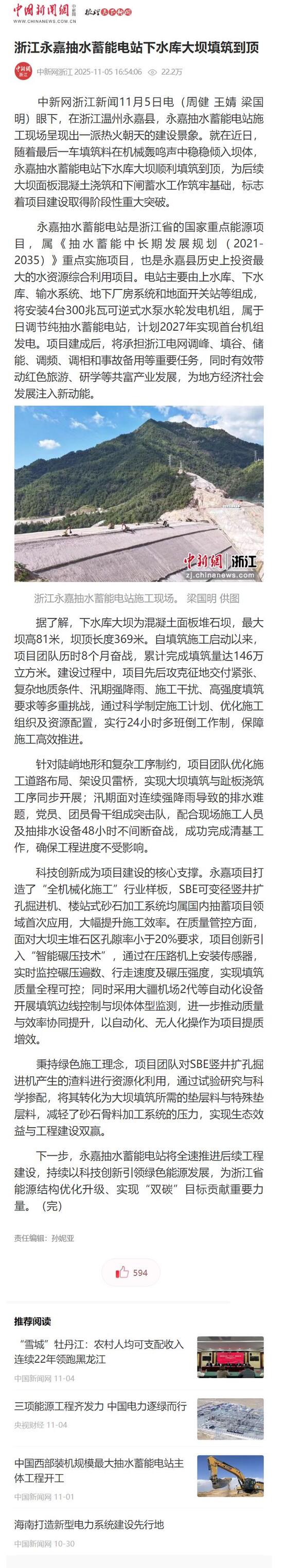 下一步,永嘉抽水蓄能电站将全速推进后续工程建设,持续以科技创新引领绿色能源发展,为浙江省能源结构优化升级、实现“双碳”目标贡献重要力量。(完