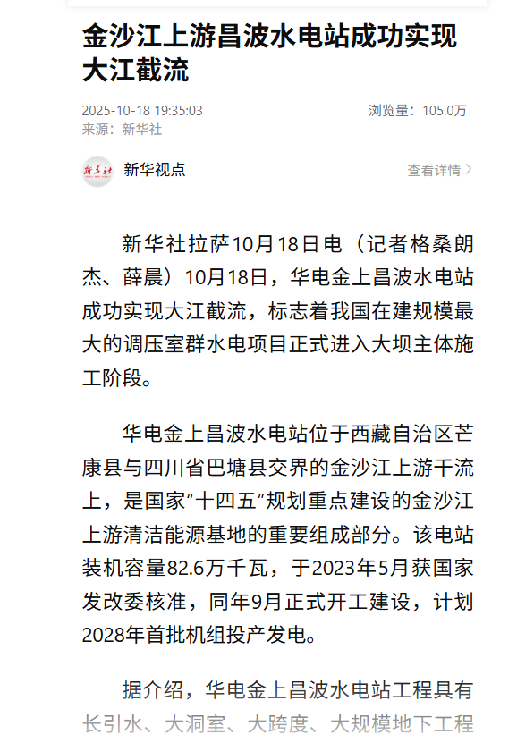 10月18日,华电金上昌波水电站成功实现大江截流,标志着我国在建规模最大的调压室群水电项目正式进入大坝主体施工阶段。