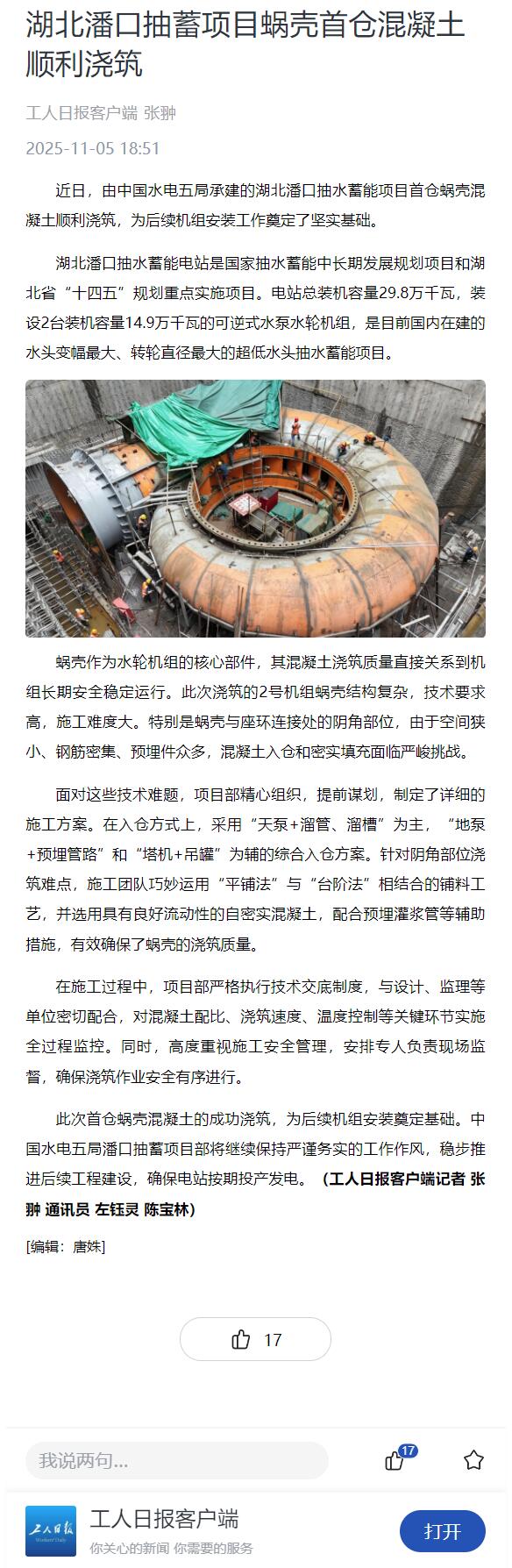 此次首仓蜗壳混凝土的成功浇筑,为后续机组安装奠定基础。中国水电五局潘口抽蓄项目部将继续保持严谨务实的工作作风,稳步推进后续工程建设,确保电站按期投产发电。(工人日报客户端记者 张翀 通讯员 左钰灵 陈宝林)