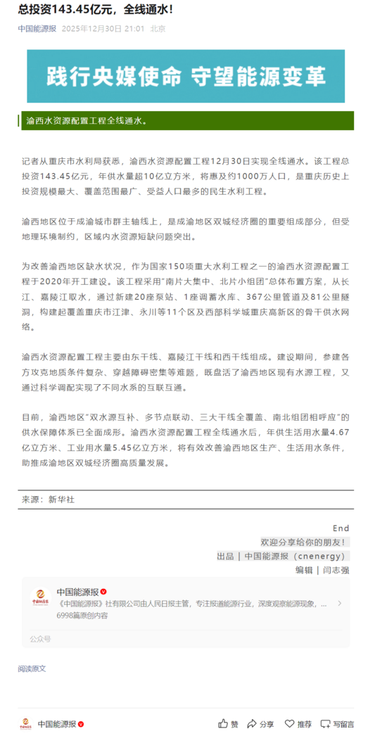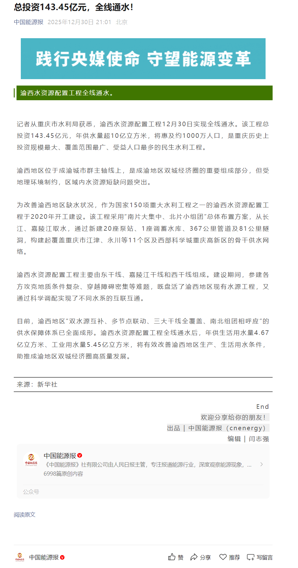 记者从重庆市水利局获悉,渝西水资源配置工程12月30日实现全线通水。该工程总投资143.45亿元,年供水量超10亿立方米,将惠及约1000万人口,是重庆历史上投资规模最大、覆盖范围最广、受益人口最多的民生水利工程。
