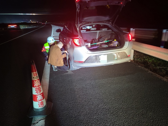 夜间视线不佳,应急车道旁车流密集,稍有不慎易引发追尾事故。路巡人员立即停车,按规定设置警示标志,划定安全作业区域。经询问得知,该车在行驶中出现车身剧烈晃动,司机只能临时停靠应急车道,检查后发现左后车轮气压不足,但因缺乏应急工具,只能焦急寻求救援。