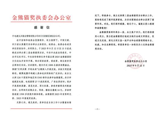 作为永久落户四川的国际文化品牌活动,金熊猫奖是推动四川文化事业发展、促进国际文化交流的重要平台。此次获得感谢信,既是荣誉,也是激励。五兴公司将以此为契机,不断提升服务品质与专业能力,进一步提升重大活动服务保障能力,持续践行社会责任,为推动四川文化事业发展、促进国际文化交流贡献更多物业力量。