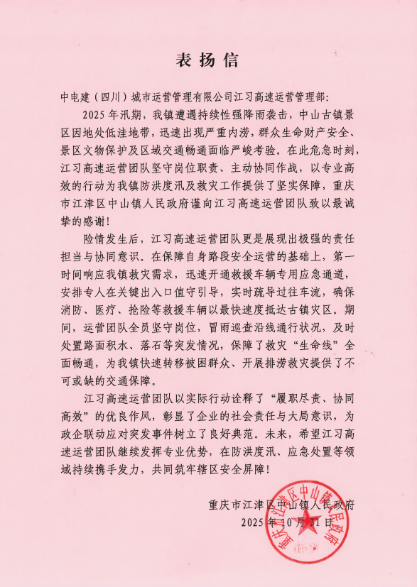 11月3日,中电建江津至习水高速运营管理部收到来自重庆市江津区中山镇人民政府的一封表扬信,信中对项目在今年汛期防洪度汛及抢险救灾工作中的卓越贡献予以高度赞扬,充分肯定了其作为央企的快速响应能力、专业处置水平与高度社会责任感。