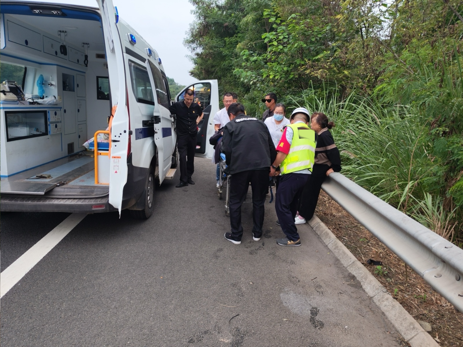 约20分钟后,救护车抵达现场。路巡队员主动协助医护人员,将受伤乘客固定至担架。因应急车道空间受限,路巡队员与医护人员合力,平稳地将伤员抬上救护车,为后续救治争取了宝贵时间。受伤乘客的家属对路巡队员的专业处置和暖心安慰深表感激,坦言事故发生时全家惊慌失措,正是路巡队员的高效处置和负责态度,让他们在危难中感受到了温暖与依靠。