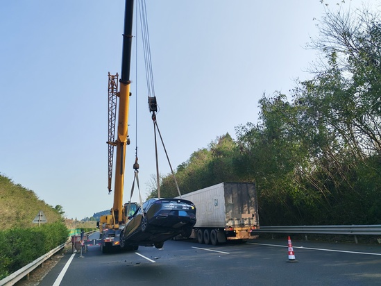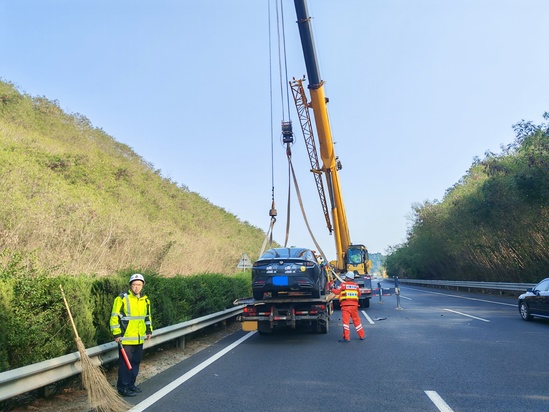 10分钟后,高速交警与施救队伍相继抵达。各方迅速分工协作、高效联动。高速交警接手现场管控工作,优化疏导方案,确保救援通道畅通;施救人员立即投入救援作业,调配吊车对侧翻车辆进行稳妥起吊与转运。经过20分钟紧张作业,事故车辆被安全拖离。随后,路巡人员快速清理现场,撤除警示标志,确认道路无安全隐患后,该路段交通全面恢复正常。