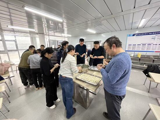 各点联动齐欢庆,形式多样暖意浓。磐安项目在职工食堂组织包饺子活动,干部职工欢声笑语,协作配合,共享羊肉汤与饺子的温暖;玉门项目联合制安分局项目部开展“党建共建暖冬至”主题共建活动,一公司领导班子成员与职工一同包饺子、亲切交流,叮嘱安全、传递关怀;赣县项目同步开展“情暖冬至 乐享团圆”包饺子活动,职工们热情参与,分工协作,围坐畅谈,在热气腾腾中共话团圆。
