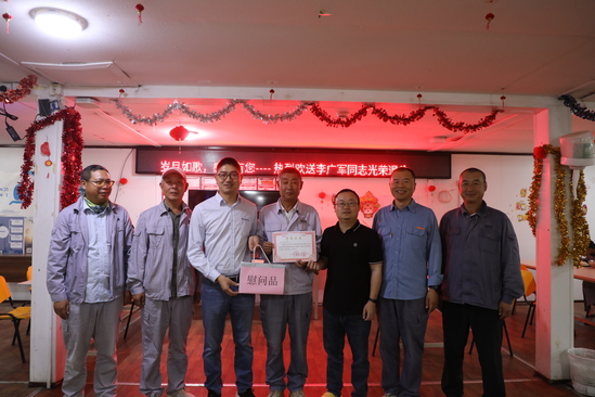 欢送会上,工会代表首先转达了项目党政领导对李广军同志的问候与感谢,并赠送了精心准备的退休纪念品。纪念品上镌刻着其工作历程中的重要项目名称,象征着永不磨灭的功绩。