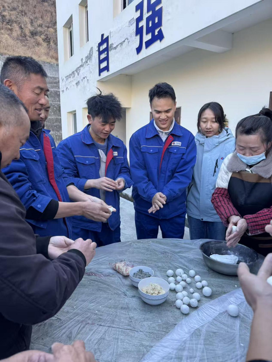 上午九点半,活动正式开始,伴随温馨音乐的响起,节日氛围拉满。活动首个环节为包饺子、搓汤圆等温情互动,在工作人员简单讲解技巧后,大家迅速围拢在餐桌旁,分工协作、各展所长。切菜、拌馅、擀皮、包捏,一系列动作“行云流水”,莲菜猪肉、大葱猪肉等馅料与洁白面皮在指尖灵动翻飞,一个个饱满圆润的“元宝”饺子整齐码放;黑芝麻、花生碎等馅料的汤圆则在掌心滚转成型,软糯可爱。现场欢声笑语不断,热气腾腾的食材与大家的笑容相映成趣,充分彰显了项目部“大家庭”的温暖与和睦。