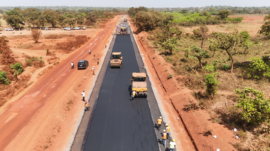 公司承建的贝宁棉花之路项目起点位于峡谷省朱古市,终点位于阿塔科拉省佩洪科市,全长72.478公里,包含城区道路、旷野区道路、现有桥梁拆除重建、新建收费站、十字路口施工、各类排水工程的施工、路面附属工程以及三网迁移等。沥青混凝土路面采用9厘米厚GB0-14沥青混凝土+5厘米厚BB0-10沥青碎石铺筑,其核心材料能够有效应对日益增长的交通压力和所在国别复杂的气候条件。目前,项目部已完成GB沥青混凝土面层的95%,即将进入最后一道面层BB沥青碎石的铺筑工作。业主、监理、设计等单位现场对试验段进行了验收,各单位均对试验段建设质量给出了高度评价。