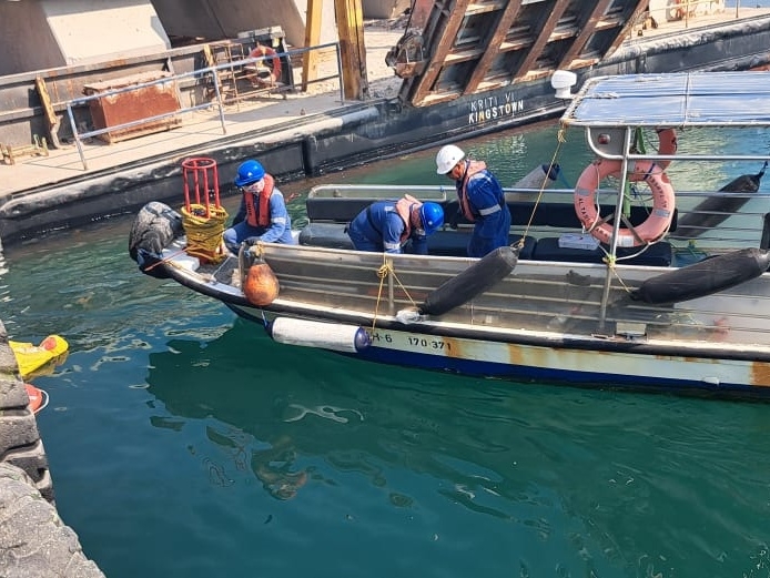 演练模拟了在2号指码头作业期间,一名施工人员不慎落水的紧急场景。“险情”发生后,现场安全员迅速启动应急响应程序,高声呼救并同步上报。项目部应急指挥中心接报后,立即启动《溺水事故专项应急预案》。警报声响起,各救援小组闻令而动、快速集结,携带救生圈、急救箱、担架等器材赶赴现场。