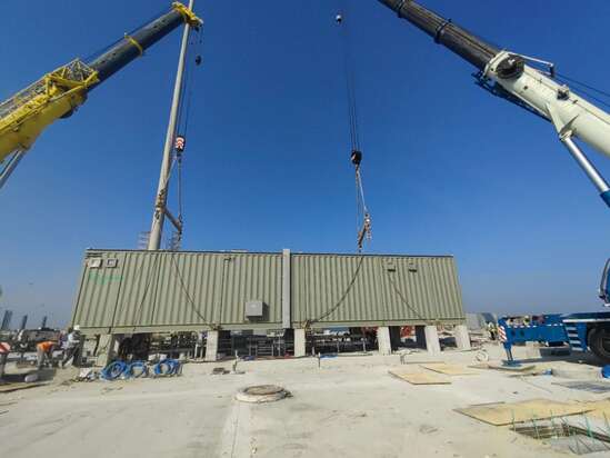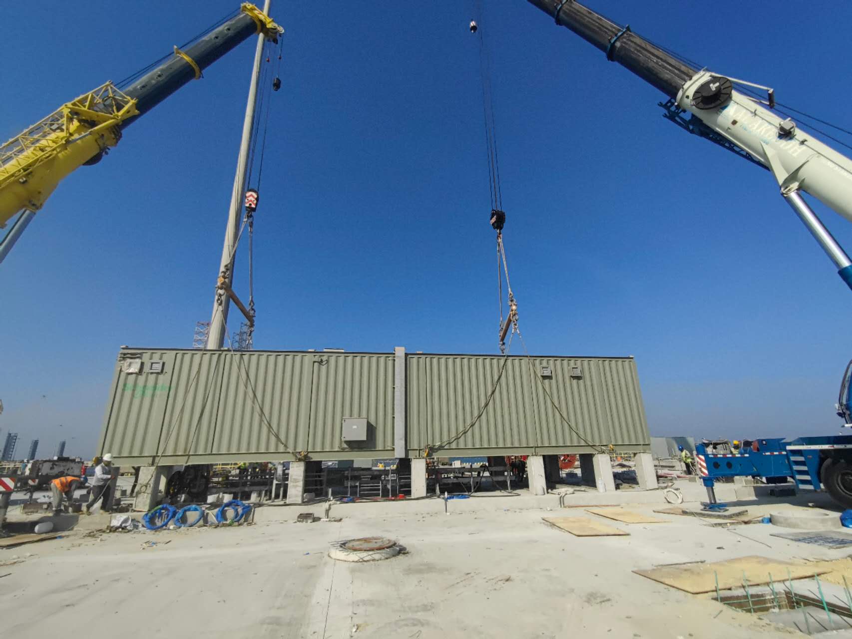 模块化变电站为电力供应二次换电的一体化设备,具有尺寸大、重量重等特点。沙特国王港项目最后三台模块化变电站最大单体长度达19米、重量高达51吨,并配置6.5吨的空调平台,属于本陆域建筑中体量最大、运输与吊装难度最高的设备之一。